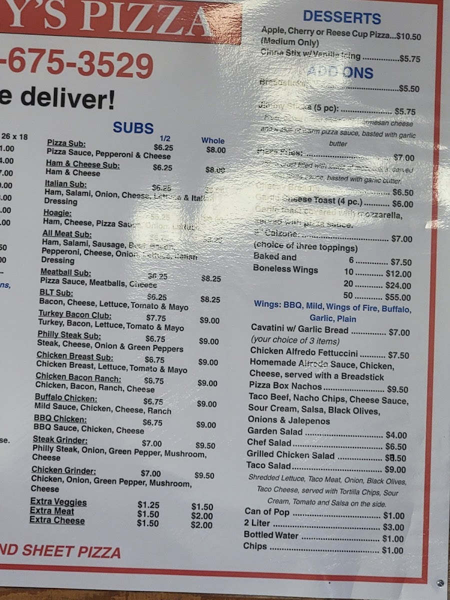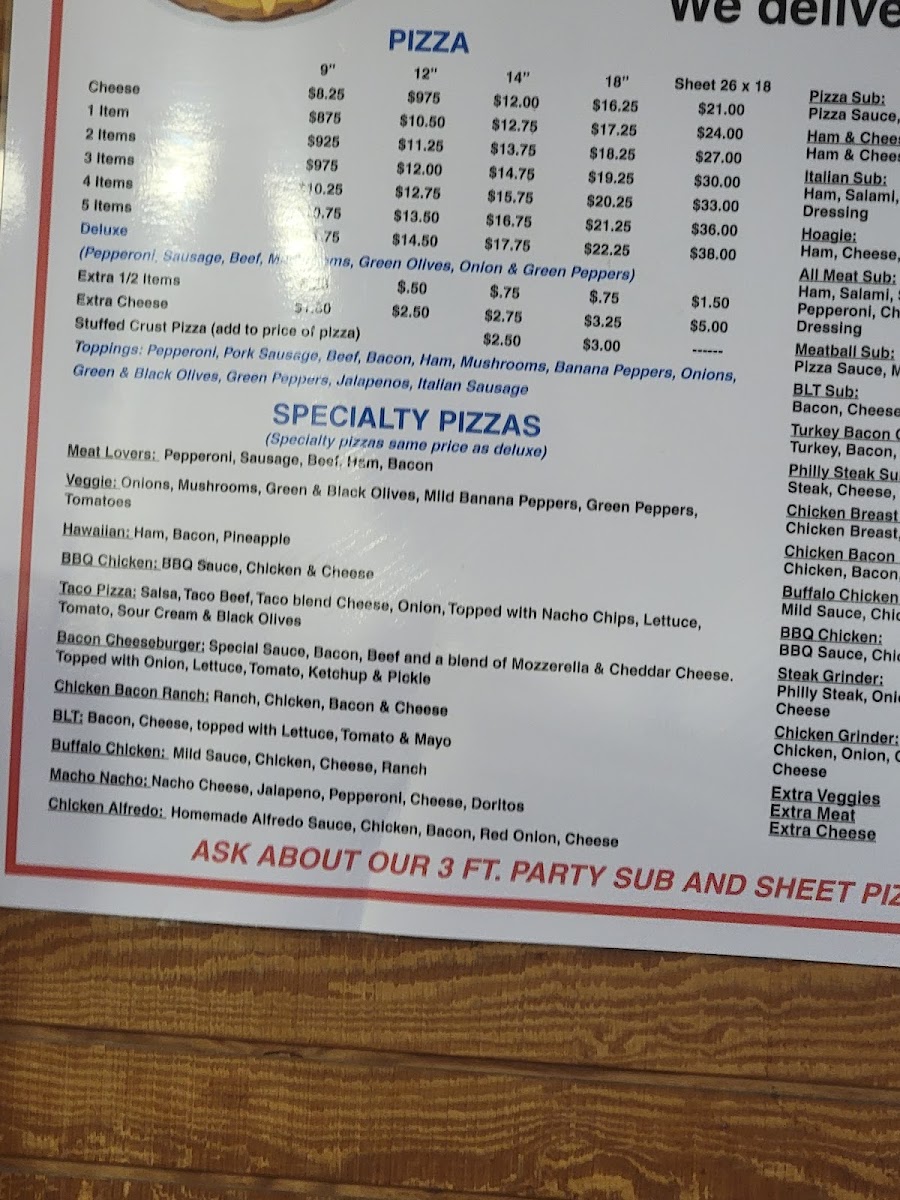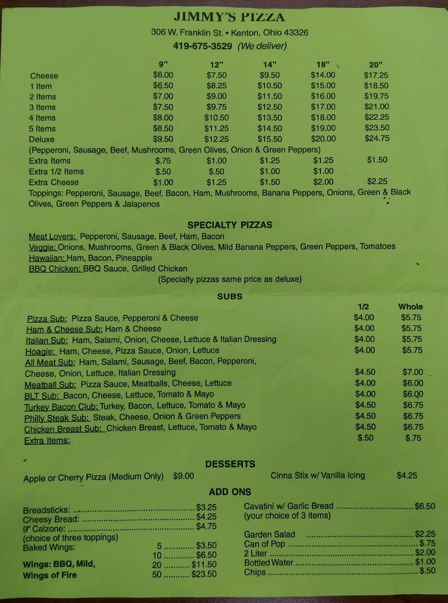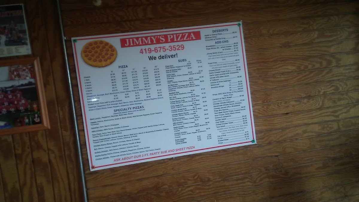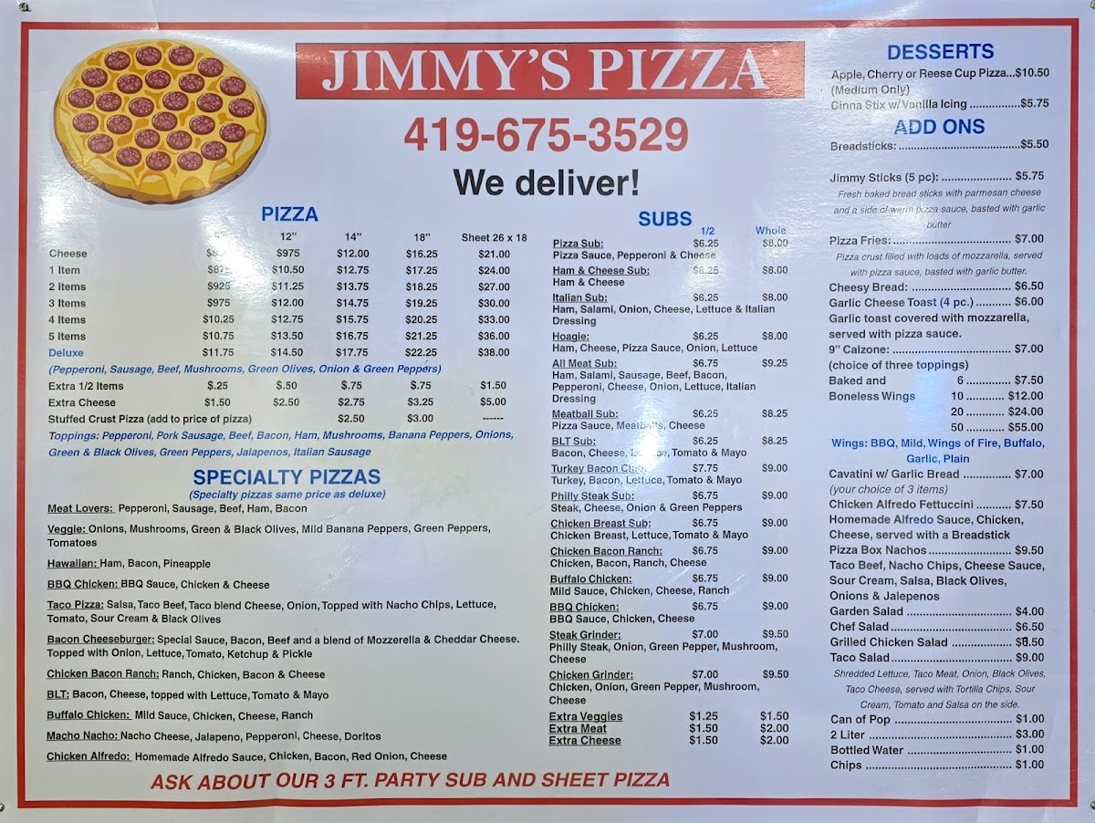 From a reviewer’s perspective, Jimmy’s Pizza offers a straightforward yet satisfying menu that covers all the classic cravings. The subs section includes options like the Pizza Sub, Ham & Cheese Sub, Italian SubHoagie, and All Meat Sub, giving a solid range for sandwich lovers. Their dessert choices stand out with unique sweet pizzas such as the Apple Pizza, Cherry Pizza, and Reese Cup Pizza, which add a fun twist to the end of a meal. The pizza lineup features staples like the 3 Items Pizza, Deluxe Pizza, and Stuffed Crust Pizza, while the specialty selection-Buffalo Chicken Pizza, Veggie Pizza, Hawaiian BBQ Chicken Pizza, and Taco Pizza-caters to more adventurous tastes. Sides and add-ons like Breadsticks, Pizza Sticks, Jimmy Sticks, Pizza Fries, and Onions & Jalepenos complement the main dishes well. Rounding out the menu are simple extras such as Can Of Pop, Bottled Water, Chips, along with heartier pasta options like Cavatini W/ Garlic Bread and Chicken Alfredo Fettuccini. Overall, while prices aren’t listed, the variety and familiar comfort-food offerings make the menu feel approachable and crowd-pleasing.